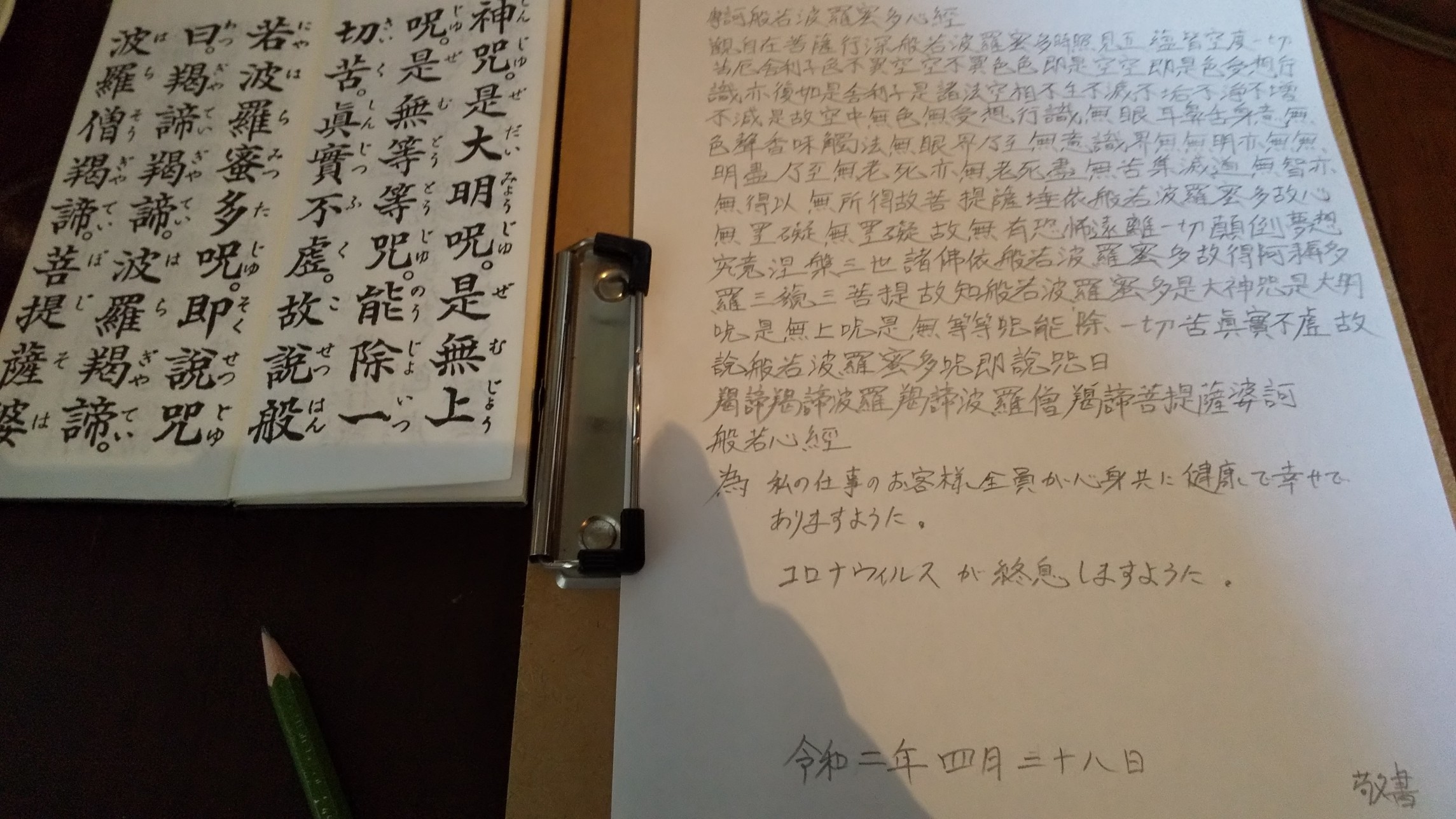 外出自粛が解かれたら、また書きためた写経を納めに行きたいと思っています。